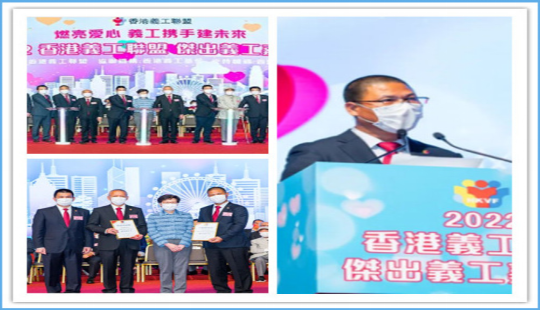 為推動義工服務發展,表彰各義工團體及義工的無私奉獻,鼓勵社會各界人士關注及積極參與社區服務,香港義工聯盟每年均舉辦“杰出義工嘉許禮”。2022香港義工聯盟杰出義工嘉許禮在九龍灣國際展貿中心舉行,百利宏控股董事長黃少康先生榮獲香港特首林鄭月娥女士頒發2022“公益領袖獎”。