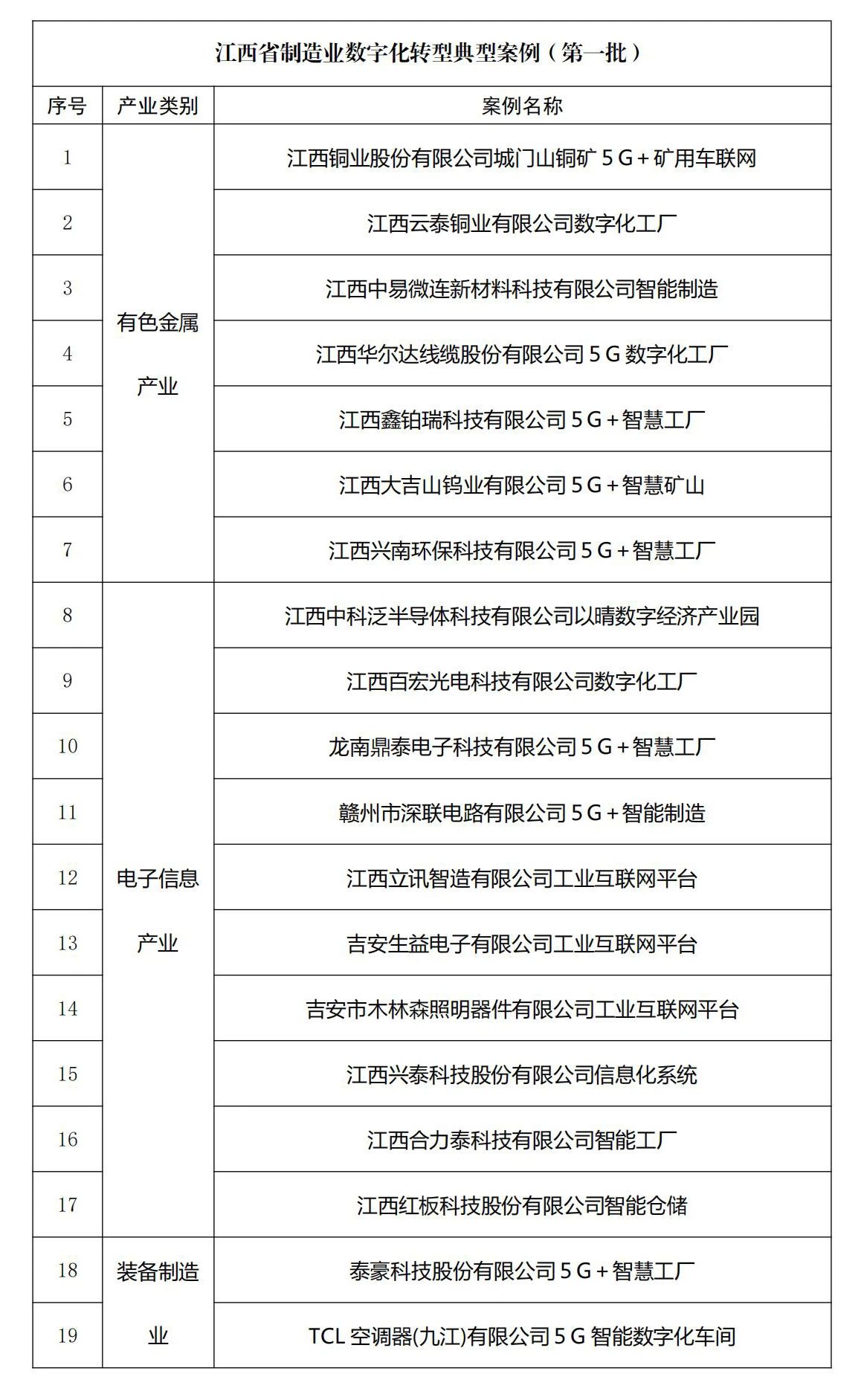 這批優秀案例由省工業強省建設工作領導小組辦公室從近年來江西省的國家級、省級制造業數字化轉型試點示范項目中遴選而來,應用領域涵蓋10個行業。其中,有色金屬產業7個,電子信息產業10個,制造裝備業11個,石化產業5個,建材產業4個,紡織產業2個,中醫藥產業2個,節能環保產業3個,新能源產業2個,輕工業3個。